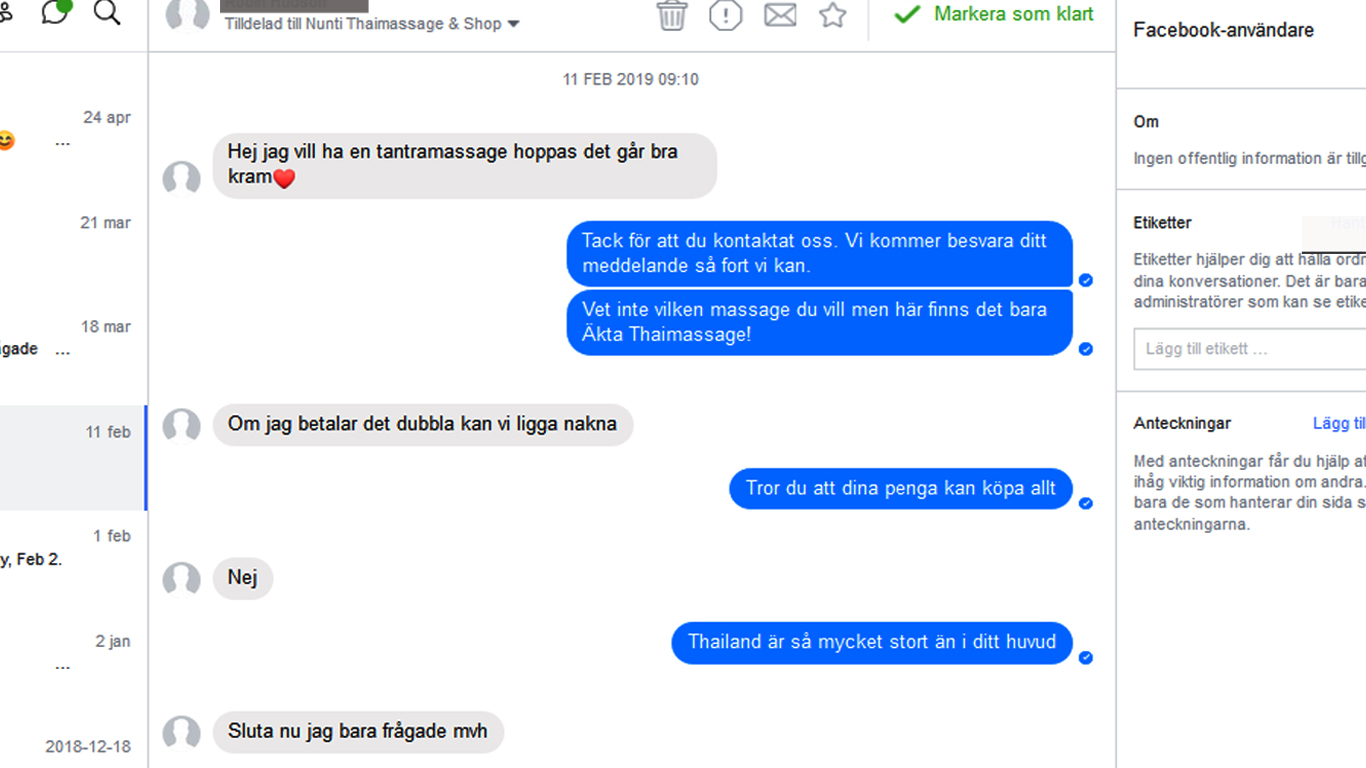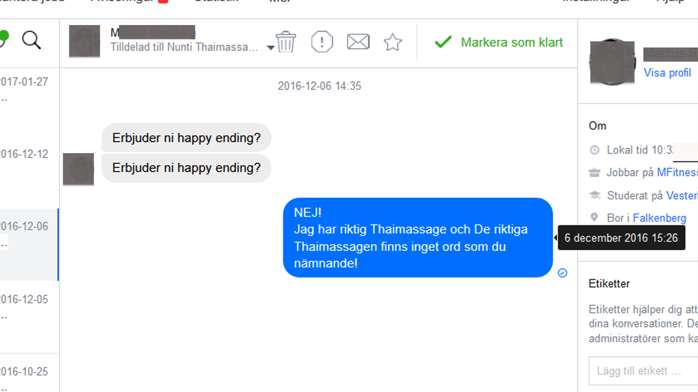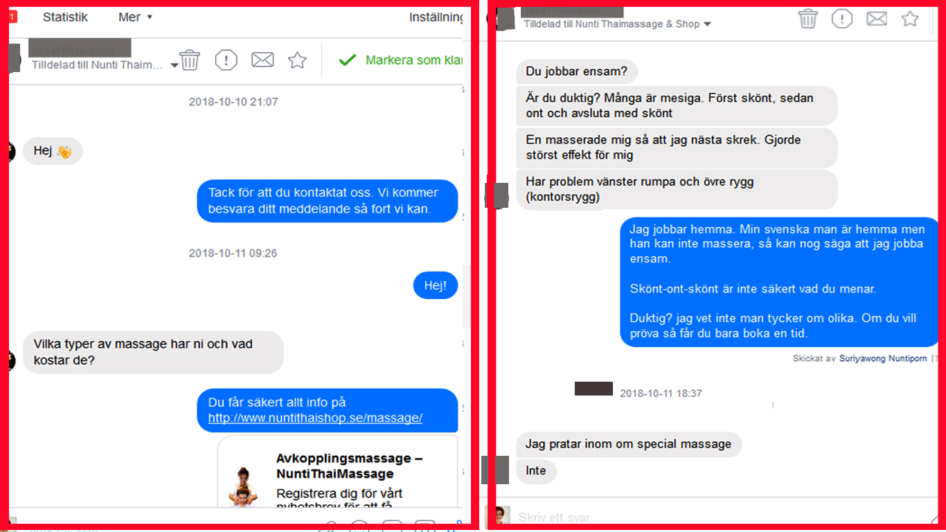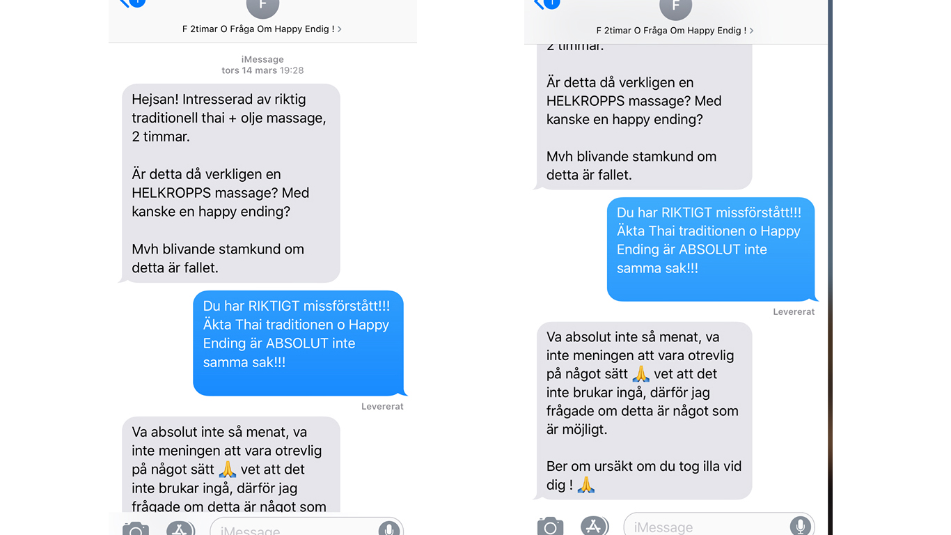 Jag tror att i alla länder i världen finns det människor som tänker och tycker olika, både goda och onda och detta gäller även Sverige. Bland de som kontaktar och frågar om Happy Ending finns både infödda svenskar och invandrare. Ovanstående exempel är bara en liten del. Det finns en del fall där jag tyvärr inte har bevisen kvar och otaliga telefonsamtal. En del ringde med ett vanligt nummer (ej dolt) och även om jag antecknat namnen på dem, har jag inga bevis utan bara minnen av samtalen. De flesta använder hemliga nummer och frågar direkt skamlöst efter Happy Ending. Populära frågor är t ex att få massage utan att ha kalsonger på, få stjärtmassage (en indirekt fråga när man inte vill ha kalsonger), en RIKTIG hela kropp massage, hur många kvinnor som jobbar (så de själva får välja) och någon annan typ av massage som syftar till sexuella aktiviteter. (**vid vanlig oljemassage får man ha kalsonger/trosor men täcker med en stor handduk och endast den otäckta delen masseras) Och nedan är en del av det sätt de frågar och hur jag bemöter dem.