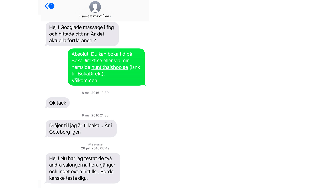 Sådana här konstiga telefonsamtal brukar komma efter att jag har haft en annonskampanj. Det är nog dumt att jag svarar på deras frågor men för mig är det viktigt att dessutom få höra hur de tänker så jag kan berätta sanningen för dem. Varje gång när jag pratar med dem indikerar min röst tydligt att jag skyddar Thaimassage men det är synd att de inte har någon empati och hör bara min dåliga svenska och upprepade gånger får jag samma fråga. Jag tror att en del av dem har varit hos mig för att testa utan att säga något och väntar på en signal eller ett tecken för ”extra tjänster”. En del försöker själva ge en ”köpsignal” t ex stön som inte har med smärtan från massagen att göra, de flyttar midjan fram och tillbaka eller försöker ta tag i min hand när jag masserar deras händer. Och även frågar direkt. Språkbarriären gör att jag blir arg på mig själv många gånger när jag inte kan säga allt vad jag vill men självklart har alla fått värdefulla lärdomar på mitt sätt, vare sig direkt eller indirekt (tystad).