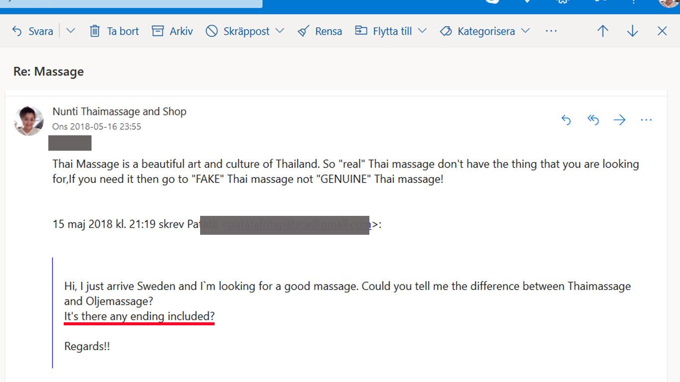 När jag började min egen Thaimassagesalong fick jag rådet av några att om jag inte ville att folk skulle missförstå att jag var en Thaimassage med Happy Ending, borde jag hitta ett namn som talade om vad jag gjorde/sålde utan att använda ordet ”Thaimassage”. Förutom att jag inte kunde komma på ett annat namn, kände jag att det skulle vara att förråda thailändsk massage och Thaimassörsvänner om jag tog ett annat namn Och det enda svaret jag fick var – “Thaimassage”. I alla fall var jag tacksam för dem som rekommenderade mig eftersom det fick mig att bestämma att jag skulle berätta sanningen för människorna. Det har du säkert sett på min hemsida om du besökt den. Oavsett om det beror på att jag använder namnet Thaimassage eller något annat har jag verkligen fått den här dåliga erfarenheten……